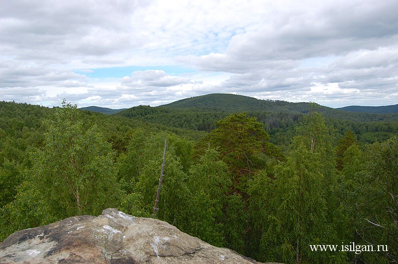 Сейчас на вершине сплошные заросли березы и вида нет ни в какую сторону. Можно спуститься вниз по склону в сторону Карабаша и с полян немножко осмотреть окрестности.