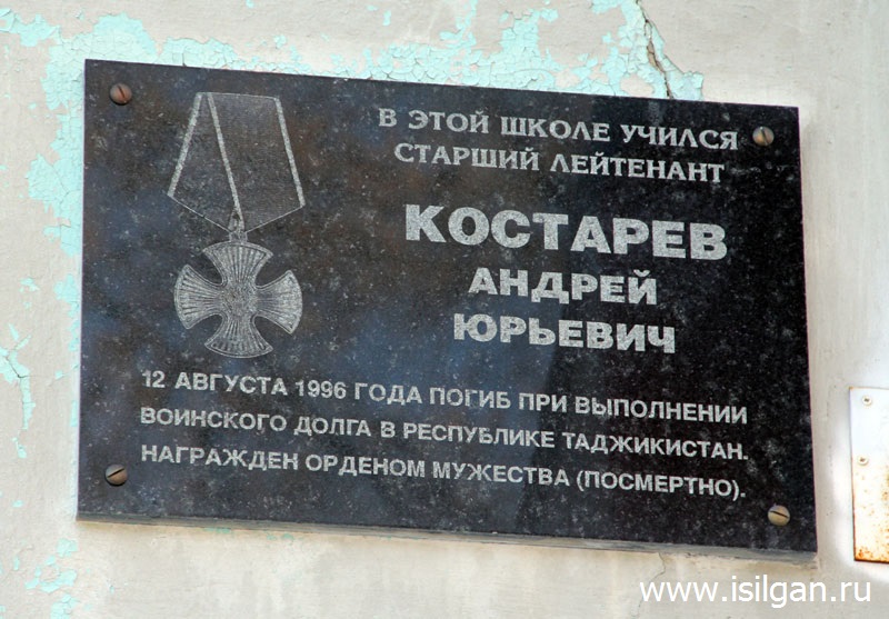 Памятная доска на здании школы, в которой учился А.Ю. Костарев. Место установки ул. Дзержинского, 25. Постановление городского Совета депутатов №115 от 25.07.2001 г. «Об установлении мемориальных досок».